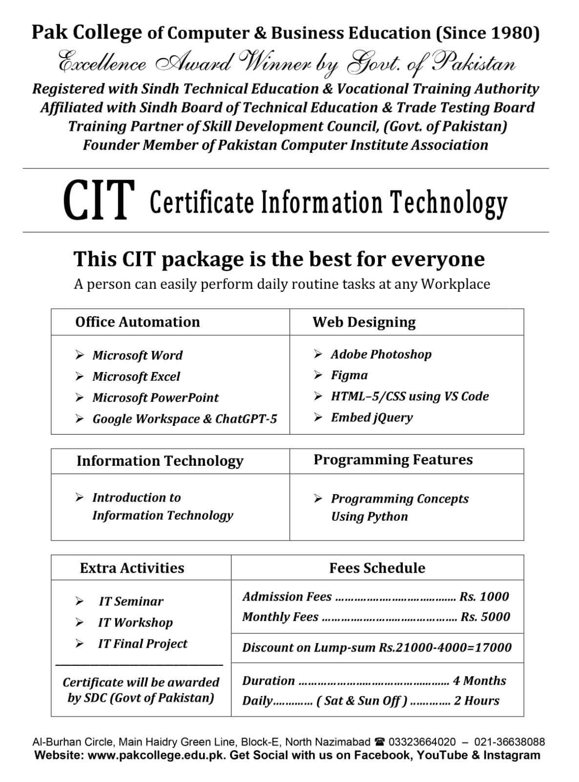 A person will be able to do daily routine work in any Office, Bank etc. This package is best for everyone. As an Information Technology (IT) major, you'll learn Office Automation, Web Designing, Information Technology & Programming FT. Python. The certificate will be awarded by SDC (Govt. of Pakistan)